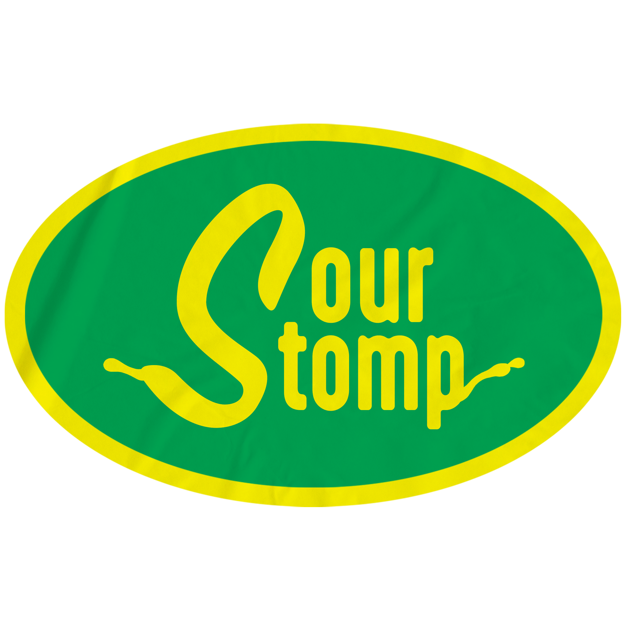SourStomp logo. The design was inspired by fruit stickers. Yellow and green are representative of sour fruit, and the designs of the S and P represent a splash of juice or shoelace.