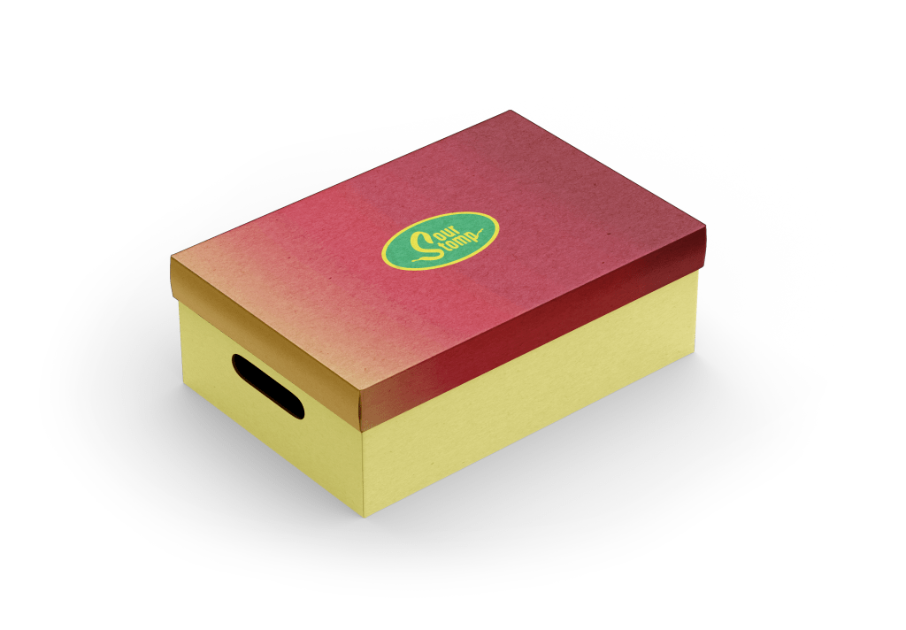Shoe box designs with color schemes representing an apple, watermelon, and mango. The apple box is for sneakers, the watermelon for boots, and the mango for sandals. Apples are universally enjoyed, watermelons are heavy and sturdy, and mangoes remind us of tropical climates.An advertisement poster.