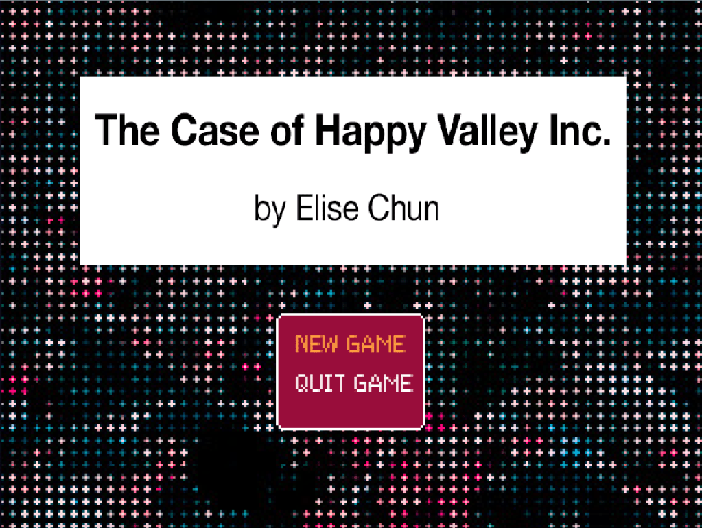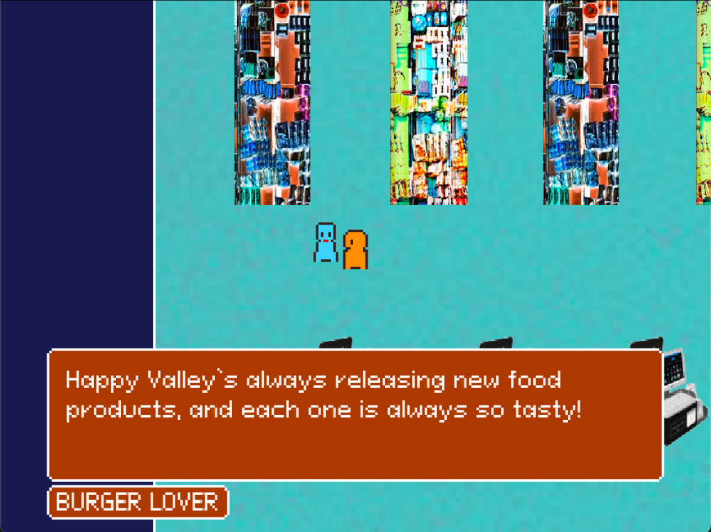 The Case of Happy Valley Inc. is an 8-bit visual novel game about a boy named Nylon who sets out on a journey to uncover the mysteries surrounding Happy Valley Inc., a corporation that has taken over his hometown, New Eden. One day, Happy Valley Inc. showed up in town and their products took over all of the markets and stores. Afterwards, Nylon notices that everyone in town suddenly seems to be acting strange, and he decides to find out what exactly Happy Valley Inc. is hiding. You explore locations, talk to townspeople, and use what you learn to ultimately reclaim Nylon’s home. The game is story-based and has an absurd tone. In terms of visuals, the game uses bright colors and an abstract style to convey its story.
